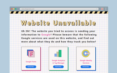 After finding out about our plugin by word of mouth or via our social media campaign, users can install our Plugin on their browser (FireFox). The Googless plugin will then block all websites with Google services (Fonts, Analytics, AdSense etc) on them and as well as informing the user of what plugins were present. People who use Googless will quickly meet our "website unavailable" page because 70% of websites use Google services. The plugin will then explain in detail which Google services are hidden behind the interface and how they handle your data. It might not be easy to get around the internet with our tool. We hope that with the use of our plugin, you get to experience the extent of the problem and, simply put, "get annoyed into action".
